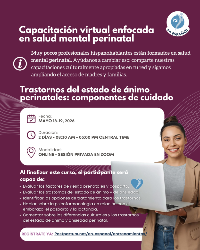 Esta capacitación de dos días, impartida completamente en español por expertas, utiliza un currículo completo basado en evidencia diseñado para profesiones como: psiquiatría, enfermería, medicina, trabajo social, salud mental, profesionales del parto, apoyo social y cualquier persona interesada en desarrollar habilidades para evaluación y tratamiento de los trastornos del estado de ánimo perinatales. La capacitación incorpora un enfoque culturalmente sensible que reconoce experiencias únicas de salud mental de las familias Latinx tanto en Estados Unidos como en sus países de origen. La inscripción incluye manual de capacitación y créditos de educación.