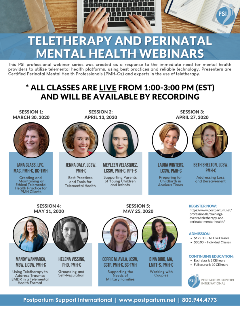 This PSI professional webinar series was created as a response to the immediate need for mental health providers to utilize telemental health platforms, using best practices and reliable technology. All sessions included attention to the priorities of confidentiality, client privacy and accessibility to telephone or teletherapy. Presenters are Certified Perinatal Mental Health Professionals (PMH-Cs) and experts in the use of teletherapy. Each session was presented live, with Q and A.