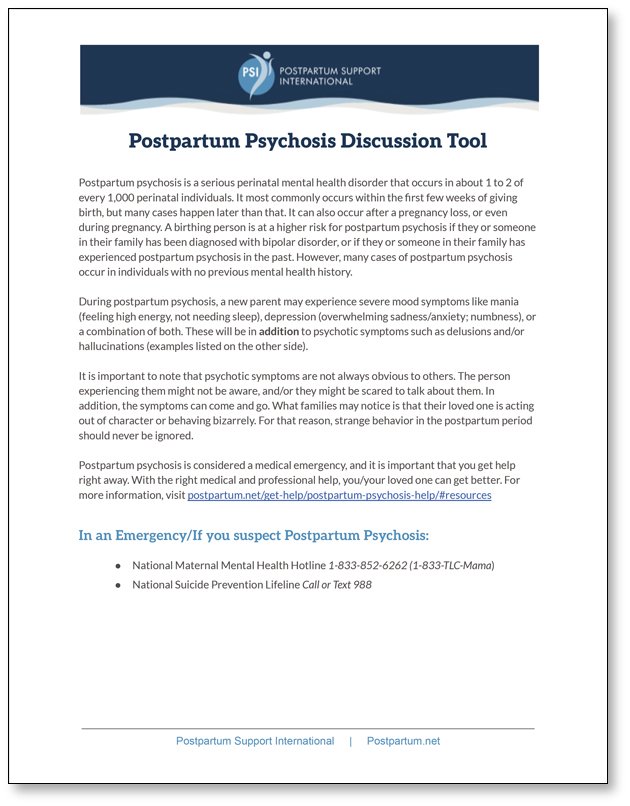 The Postpartum Psychosis Discussion Tool was developed by the PPP Taskforce. This tool is available in English and Spanish.